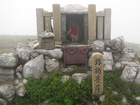 頂上からの東登山道へのピークに弥勒菩薩 |