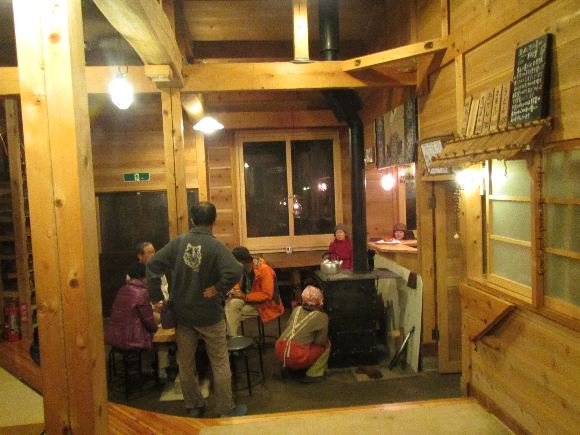 山小屋での夕食時は、初めて会う人達との会話も楽しい。