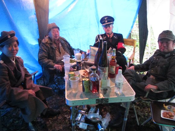 雨避け対策のされたタープの中で、久々に会う戦友たちと酒宴が始まる。