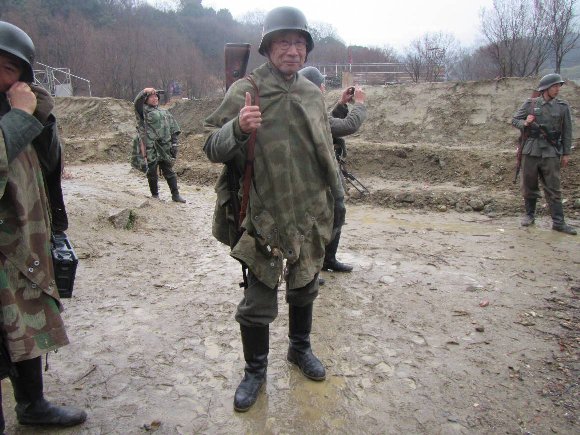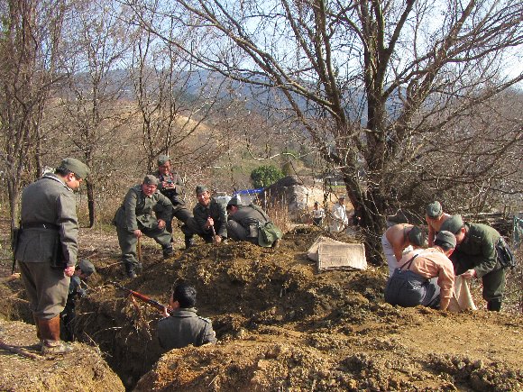 雨で泥沼化した塹壕の中で、死体を演じている仲間たち。