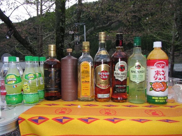 ウィスキー「竹鶴」 、黒糖焼酎「高倉」 、メキシコ 「虫入りテキーラ」 、キューバラム酒「ハバナクラブ」 、カクテル用ポンジュース、炭酸水、氷、