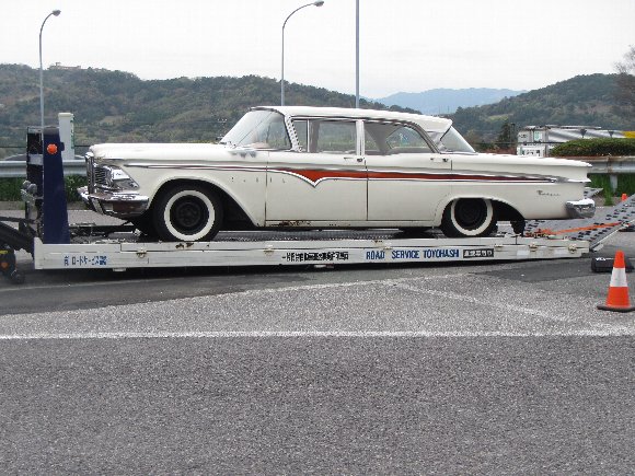 高速道 PAで見つけた キューバにいるような車 故障らしく キャリー車で回収中 |