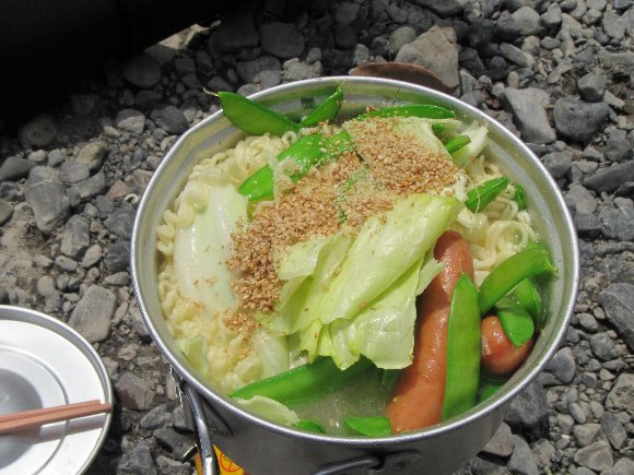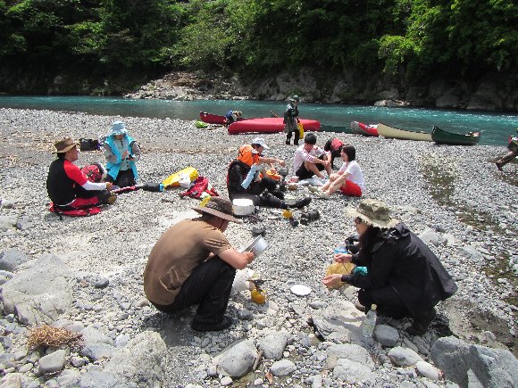 12時半ごろ 送電線下の川原で昼食 |