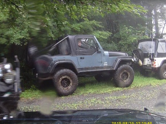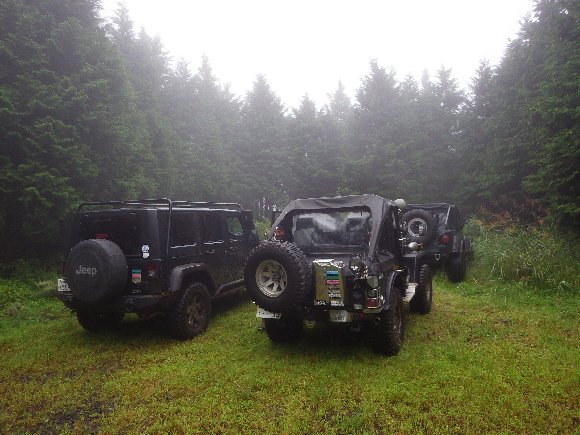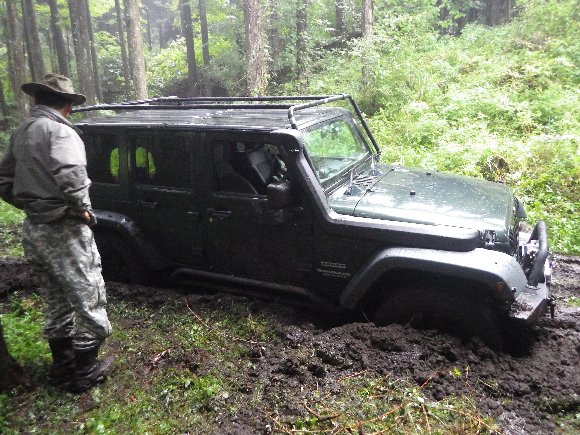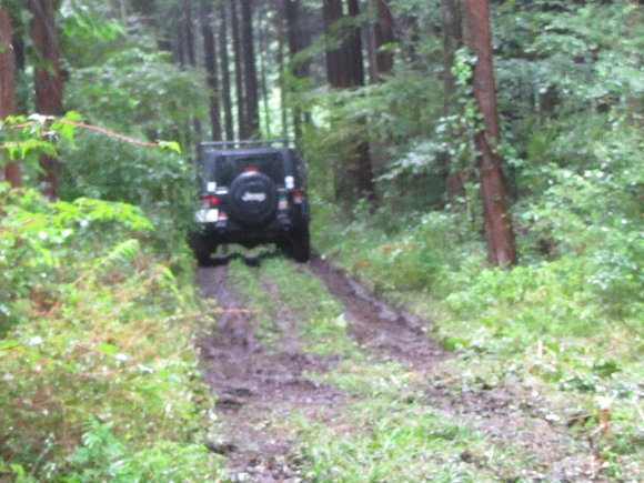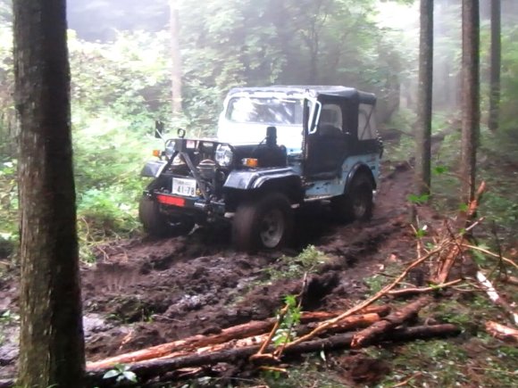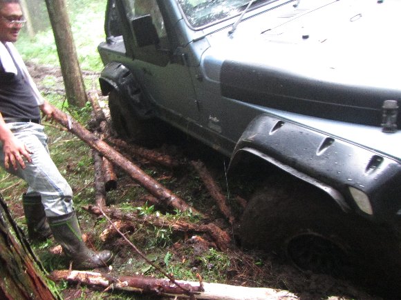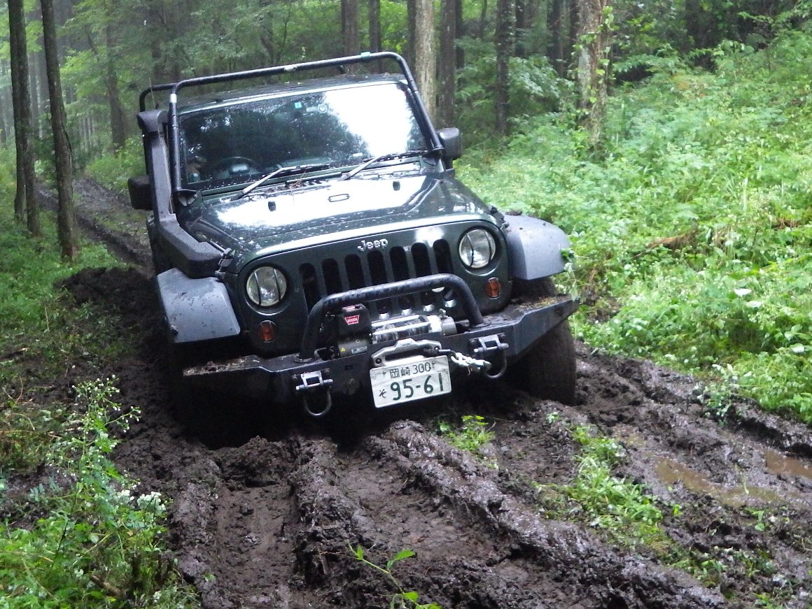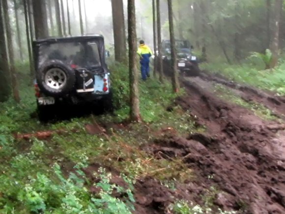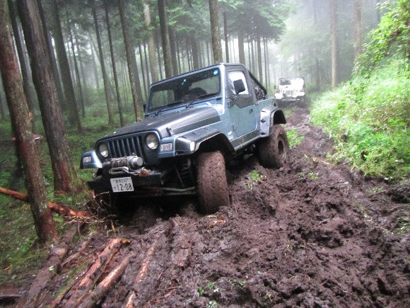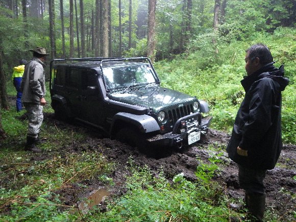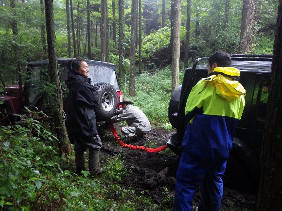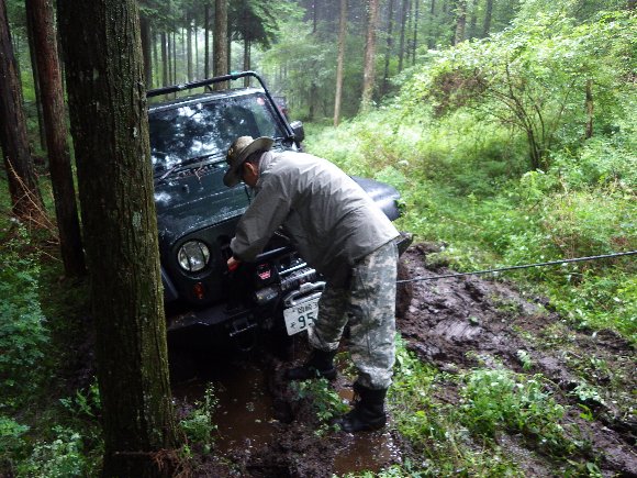 ヌタ泥から抜けきらないので、先行車 TERU-TJKさんの、TJにウィンチをつないで 脱出成功。