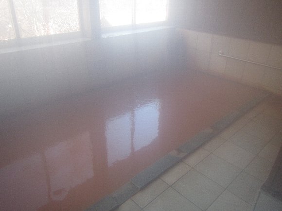 しかし、かけ流しの濃い赤褐色の湯は、とっても柔らかく心地良い。