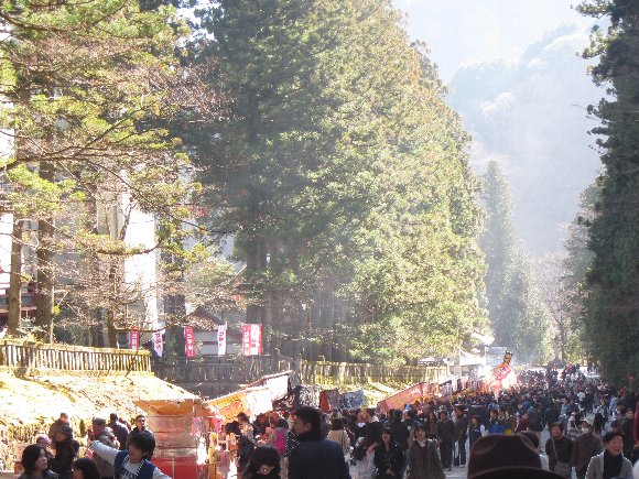 大混雑の東照宮参道を横切り |