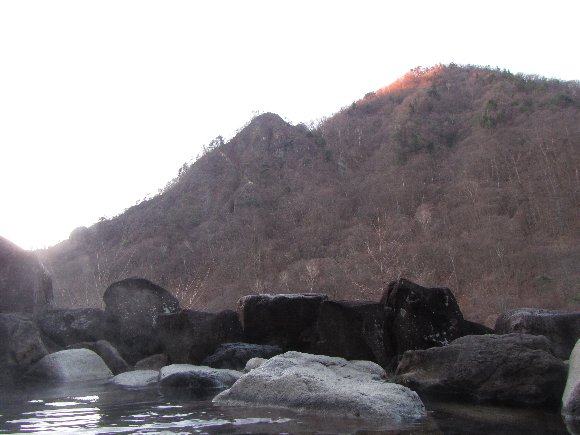 露天風呂からの朝日を受ける山 |