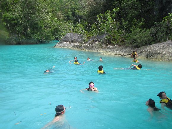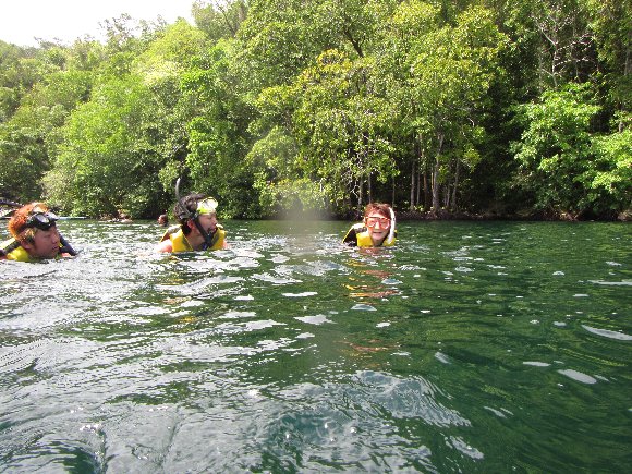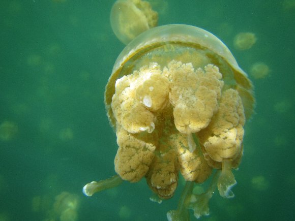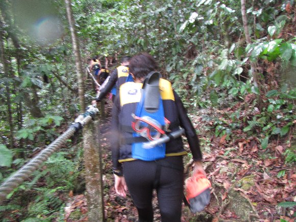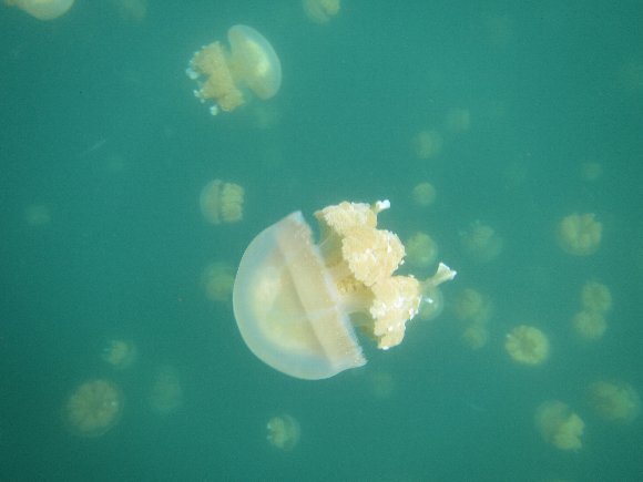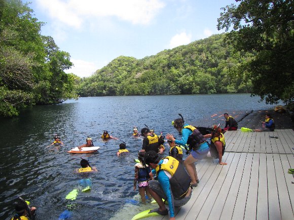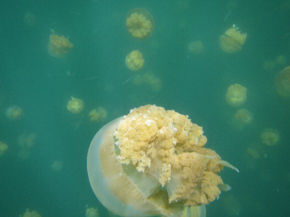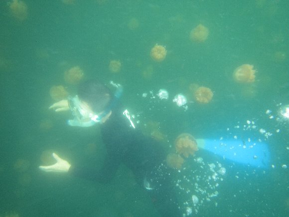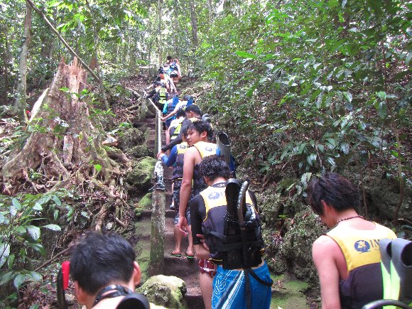 山道15分ほど歩く急坂を上り、急坂を降りると湖に着く、 10分ほどレイクを泳ぐとジュエリーフィッシュの生息地