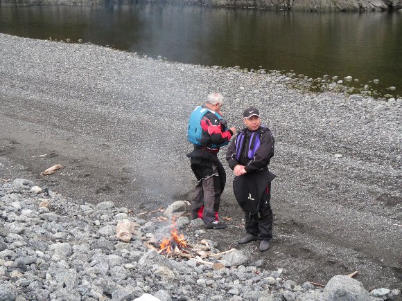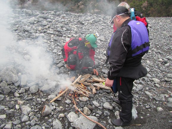 小雨模様でちょっと肌寒くかんじるので、流木でたき火。