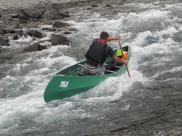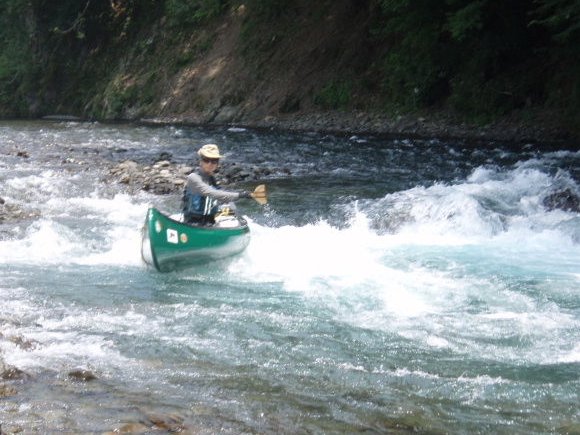 6月19日 前回気田川を漕いだ時に、水位低下でできた笹合手前の落ち込で はるカミとのタンデムで豪沈した所。