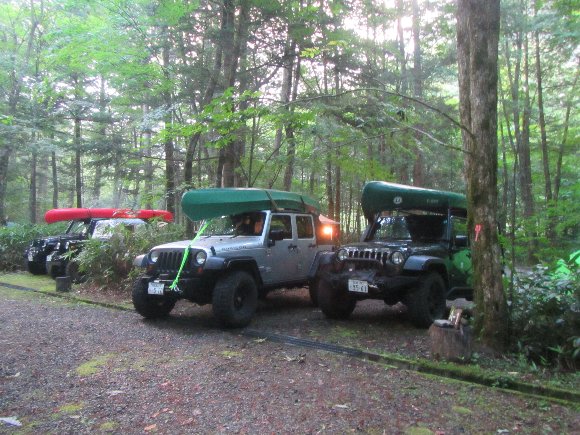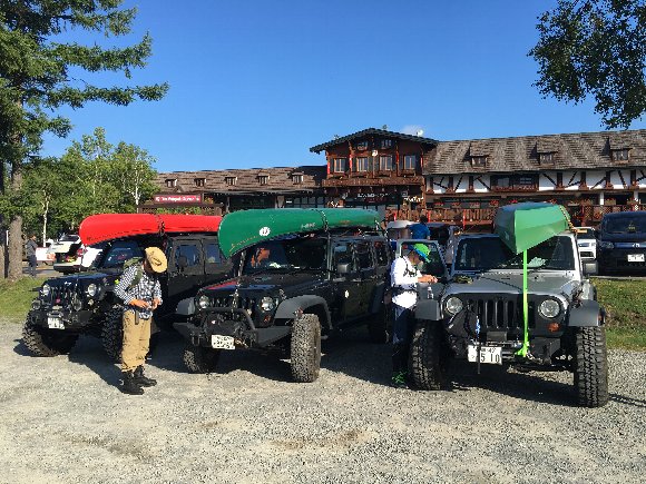 カナディアンカヌーを積んだJeepラングラ―JKが3台 三菱Jeepが 1台 が集結