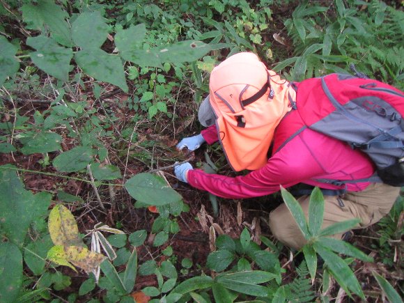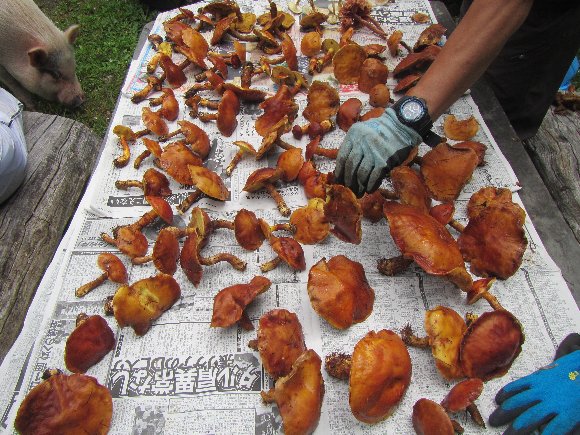 山の中、道でない森、急斜面を登ったり、降りたりと3時間ほど きのこを探して歩き回る。