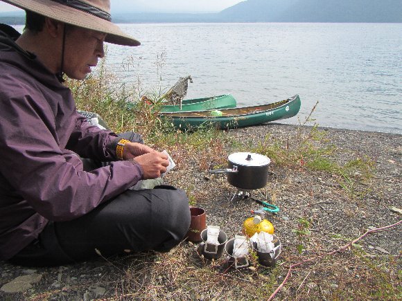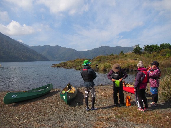 本栖湖畔でカヌーを降ろし |