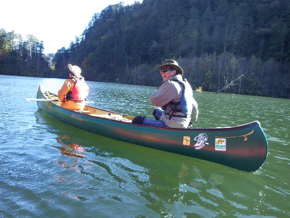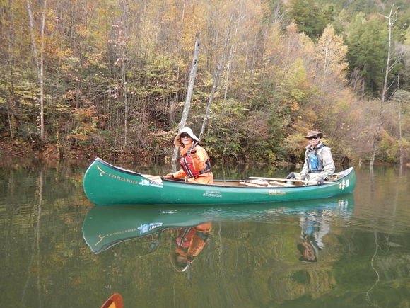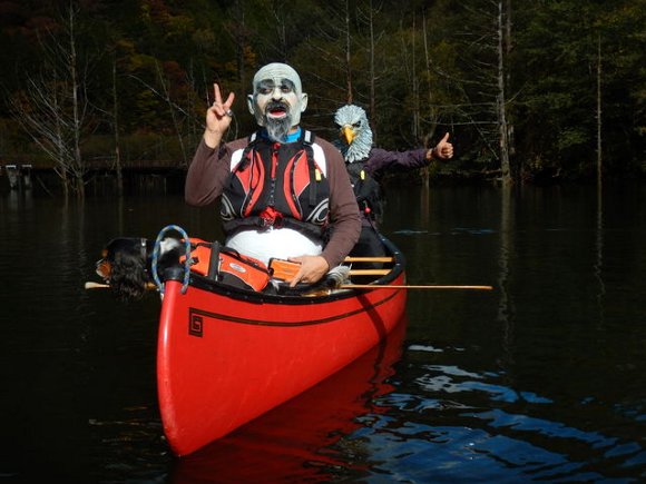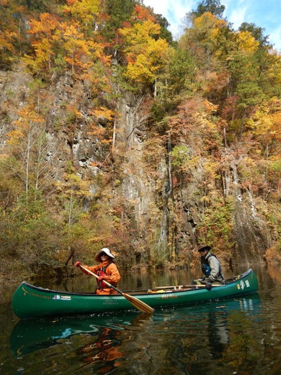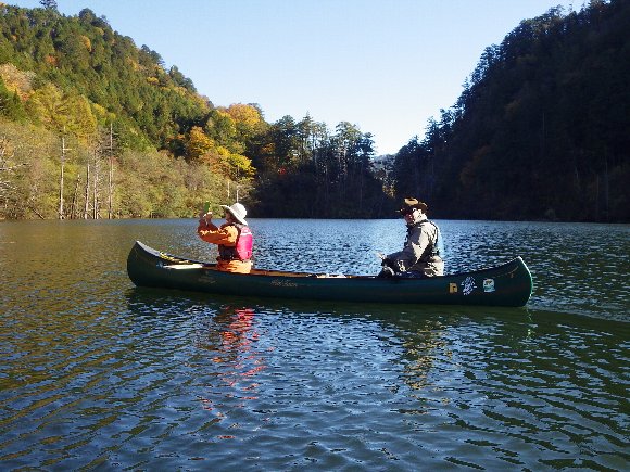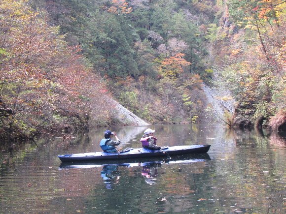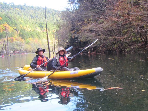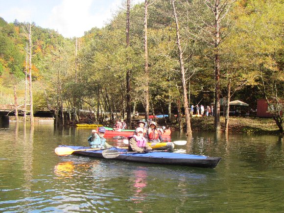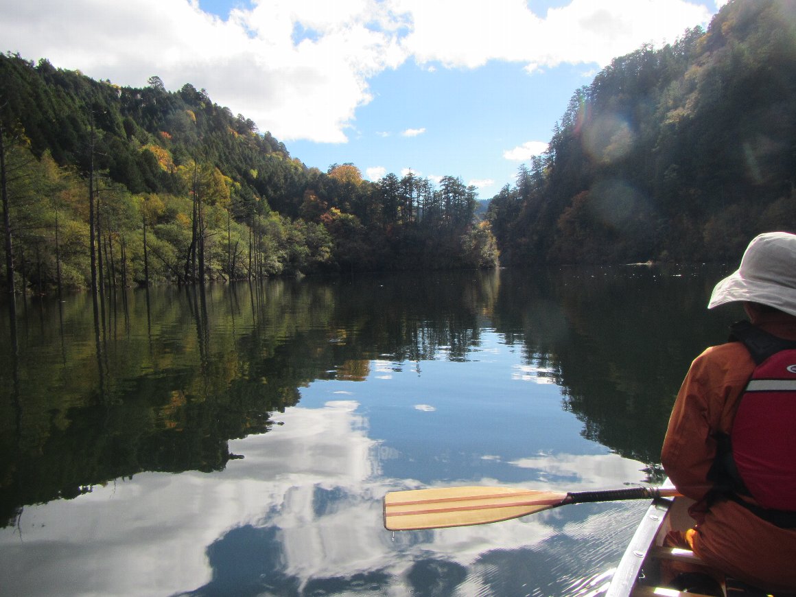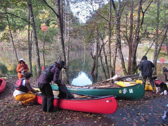 紅葉の自然湖へ漕ぎだす。