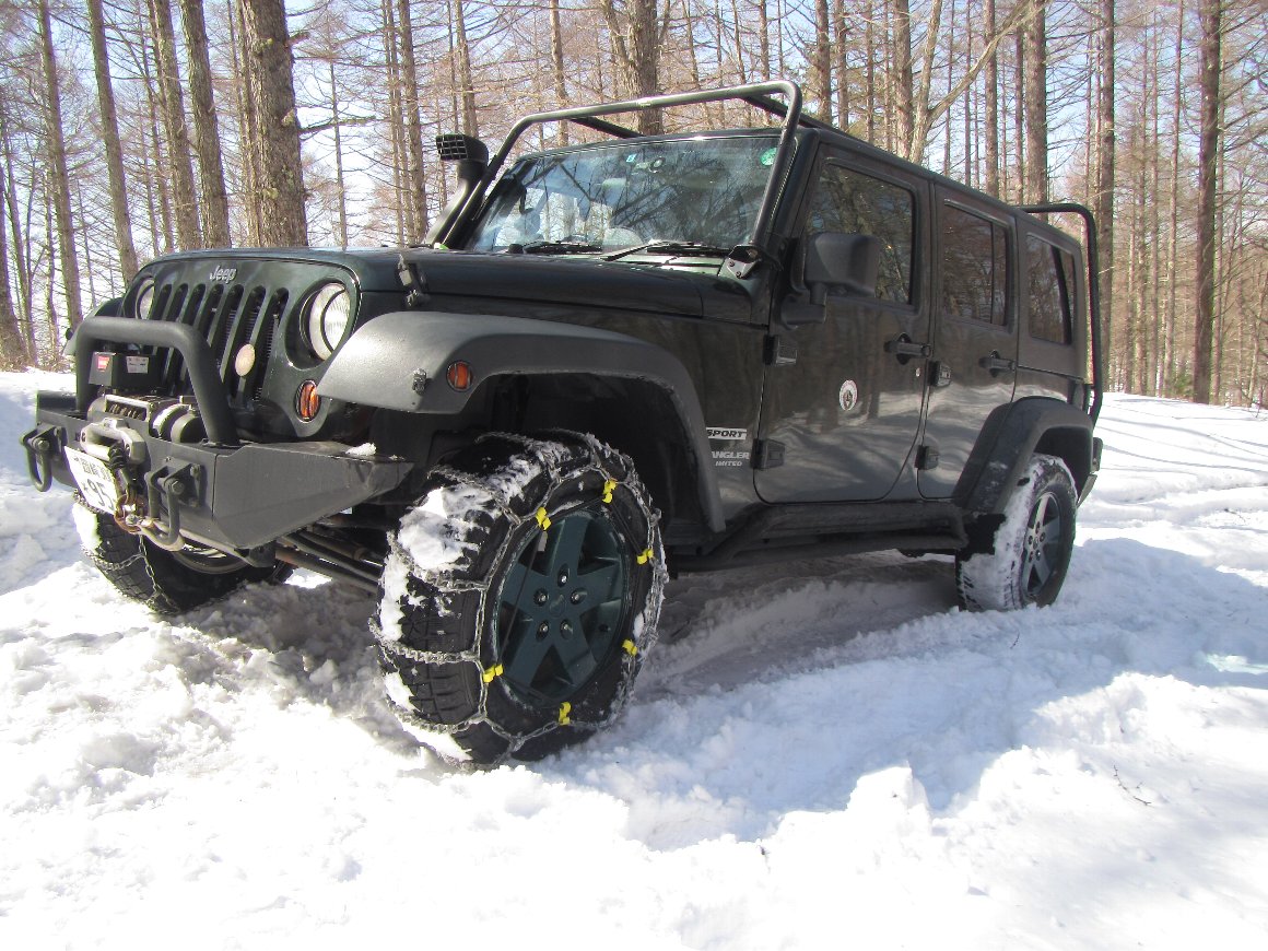 この車両は、後輪クリアランス不足のため、タイヤチェーンは前輪にしかつけていない。