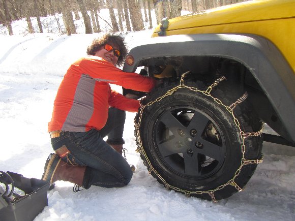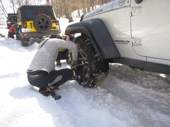 みな、タイヤチェーンを装着