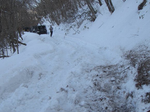 しかし、雪はさらに深くなり、2輪チェーンでは進めない。