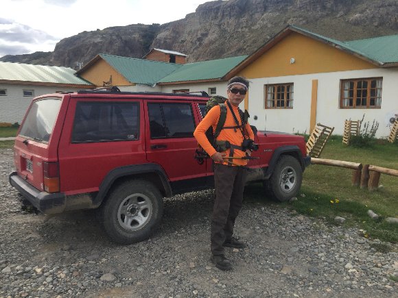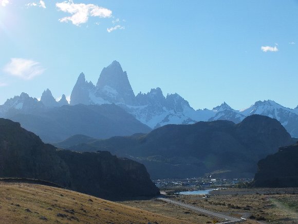 エル・チャルテンの街が見える丘に停止、逆光でああるが フィッツロイの写真を撮る。
