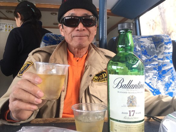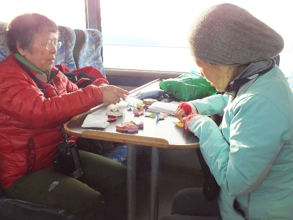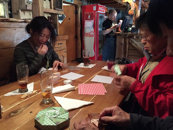氷河クルーズなのに せっせと折り紙をする |