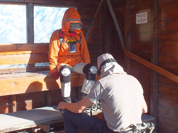 アイゼンを装着してくれて 「足を開いて歩いてください」と、日本語で注意 |