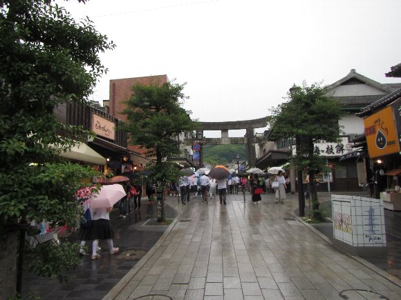 小雨降る中、傘をさして参道を歩き、天満宮参り