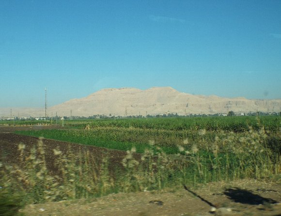 ![]() 肥沃なナイル河流域の畑と遠くに岩山が見える |