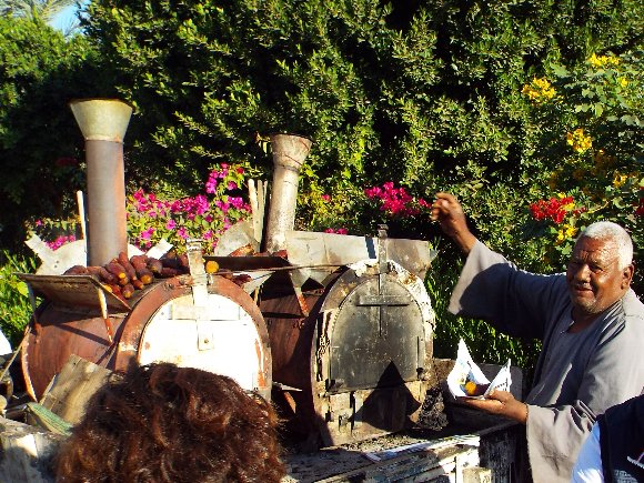 ロバに引かれた焼き芋屋を見かけてバスを止める。