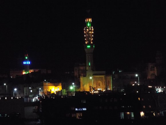岸辺のモスクの塔は ネオンで目立つ |