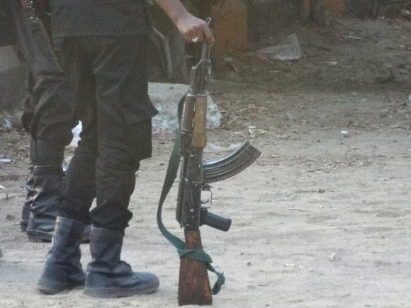 野外博物館の警備の警察官のカラシニコフ・木製ストック |