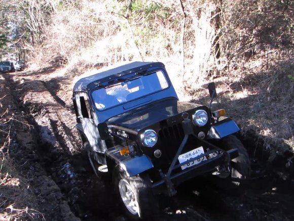 後に続く三菱Jeepは、ワダチを避けて走行