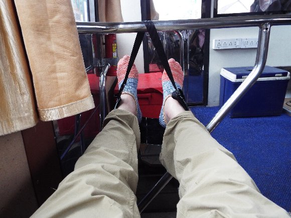 バスでの長旅も、飛行機用のフットレストで 楽ちん |