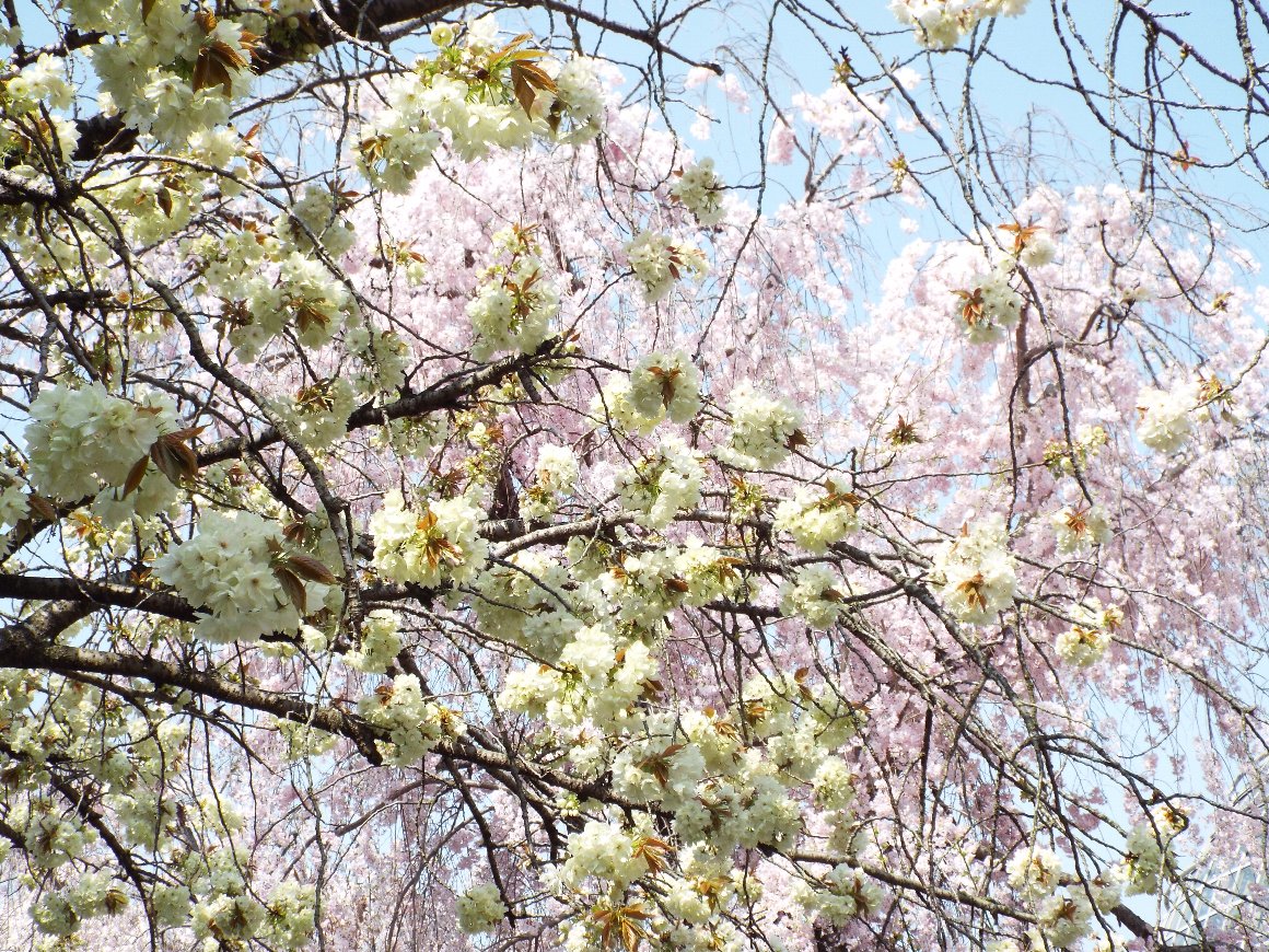 2018.04.04 緑色のウコン桜の向こうは枝垂れ桜 |