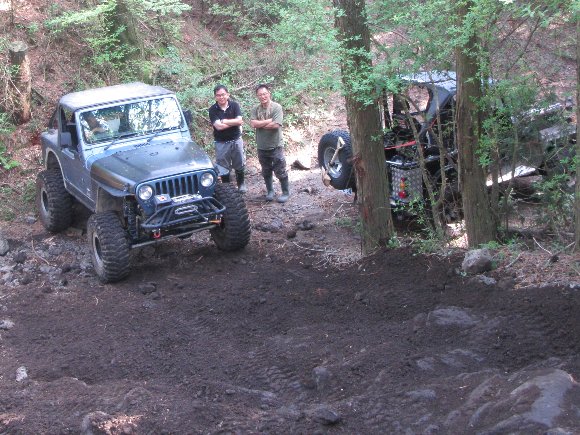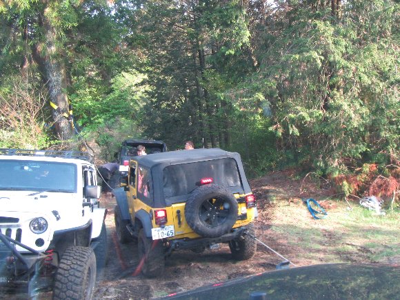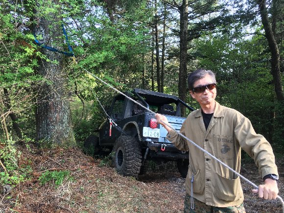 車幅のあるJKから ジムニーまでが通過できる幅にするため、私の車のウインチを使って幅の調整をする。