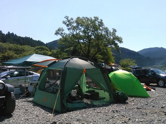 ![]() 神社前河原にベース設定 このドーム型が問題のタープだ。 |