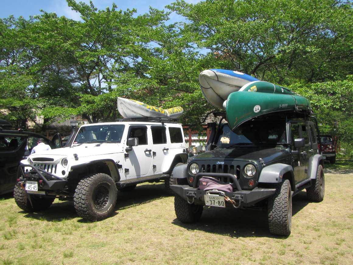 初めてカヌーを積載した、ホワイトJKアンリミ と いつもの3艇積載の JKアンリミ |