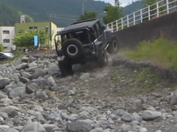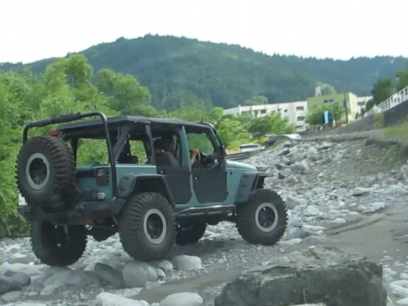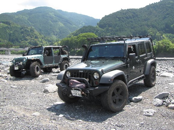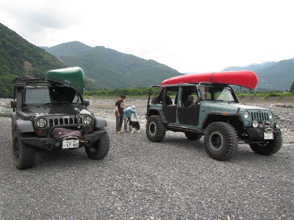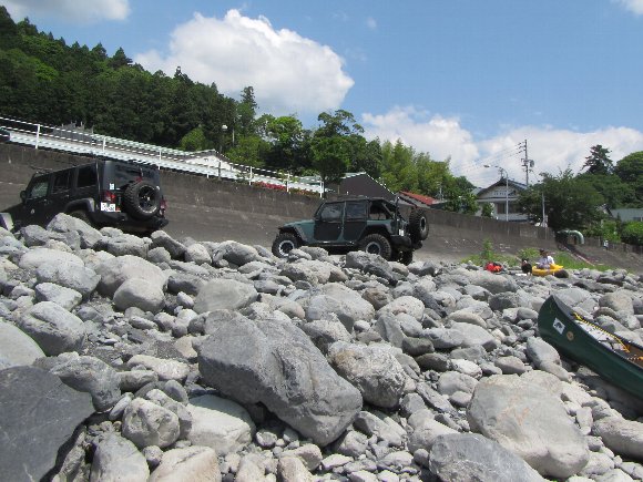 ま、そこは無敵のJeepラングラー 河原へ降りる |