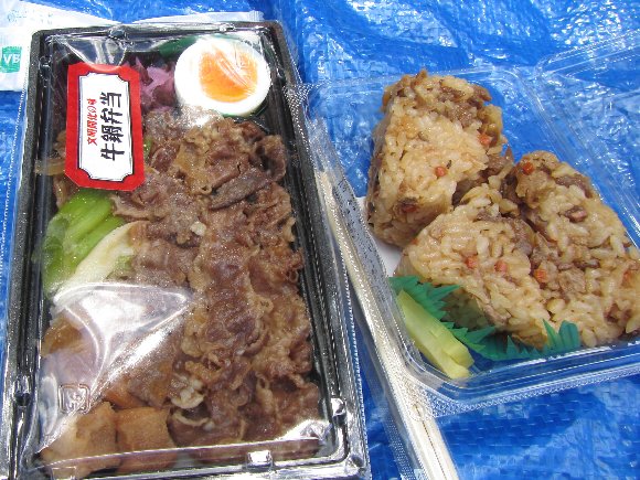 御在所SAで購入した、柿安の牛鍋弁当とおにぎり |