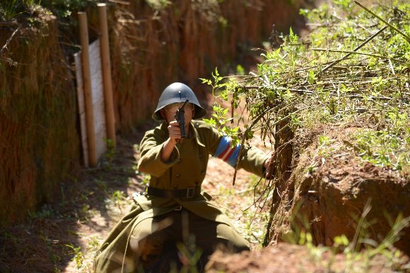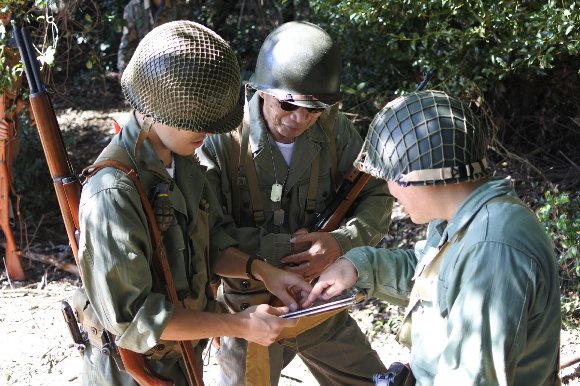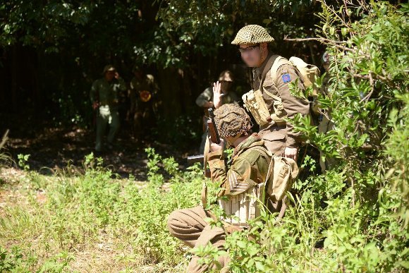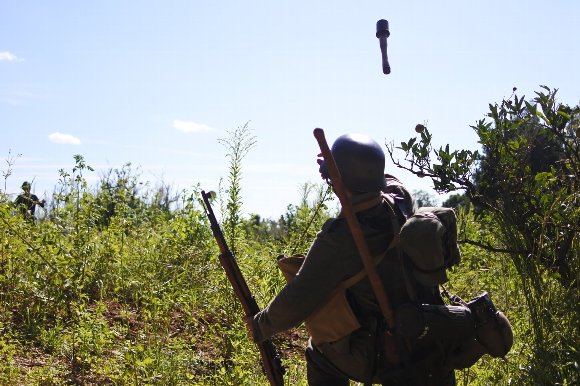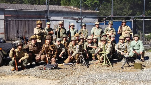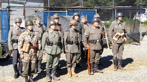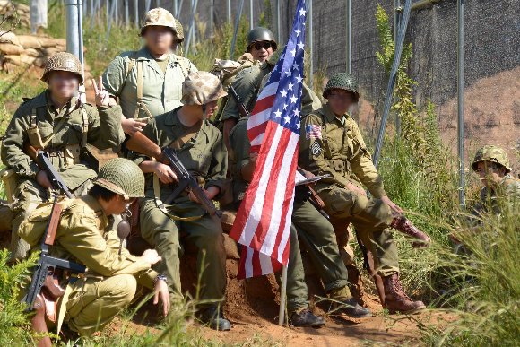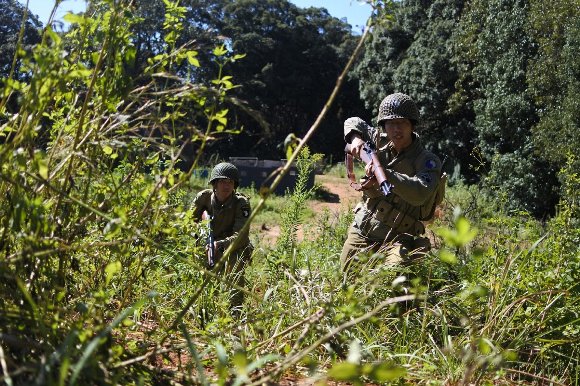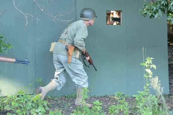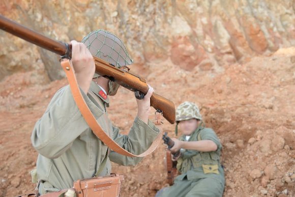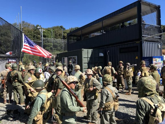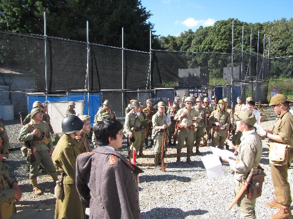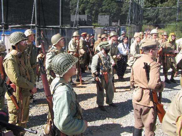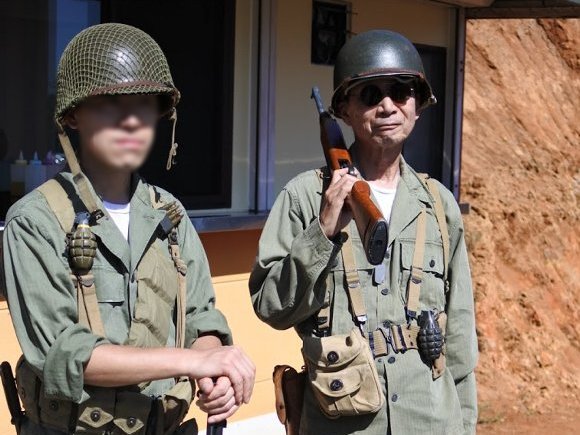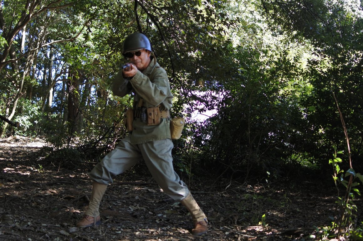 この日の私は、米陸軍装備 気温が高いので、HBTジャケットを着用 M1ヘルメット(カバーなし) 銃はM1カービン ガバメント1911