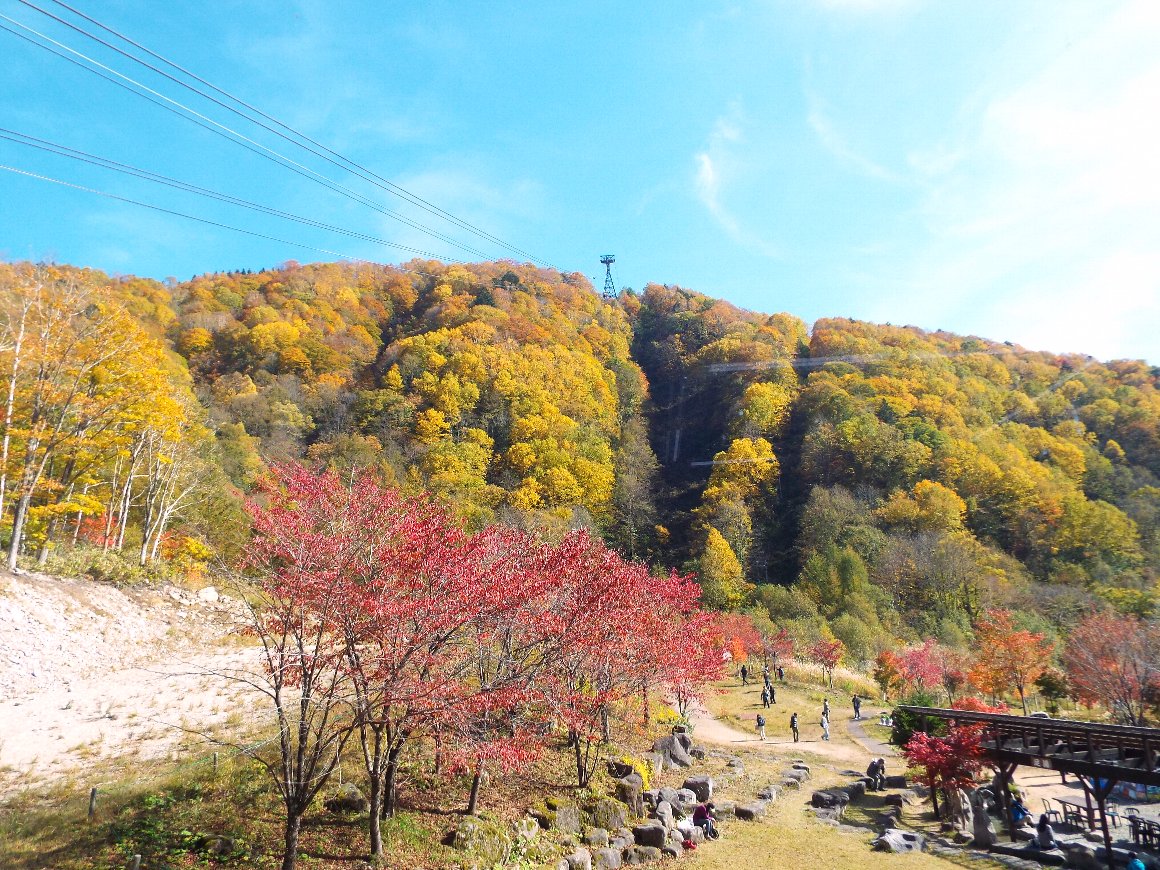 帰りのロープウェイから ゴンドラの影が紅葉に写っている |