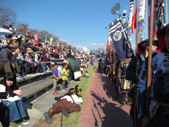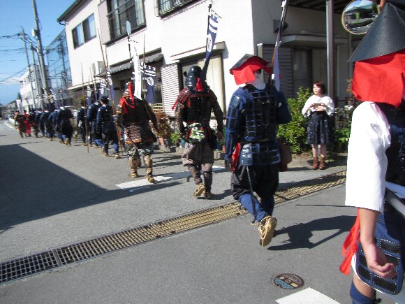 街の中を行軍し、合戦場の河原へ