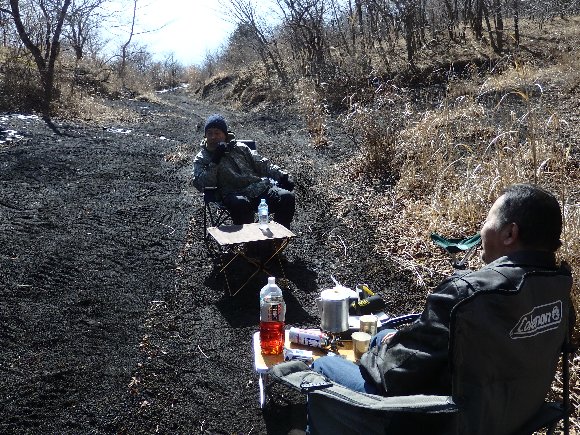 昼近くなり、晴れてきたので 風をさける所で 昼食
