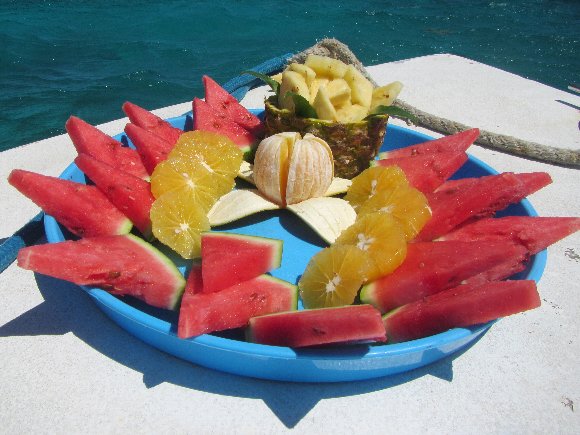 船に上がると、フルーツのお出迎え