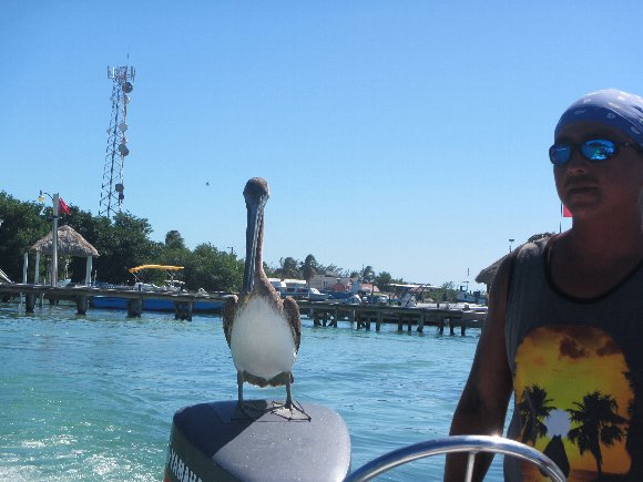 船のエンジンの上に乗り ちゃっかり便乗するペリカン |
