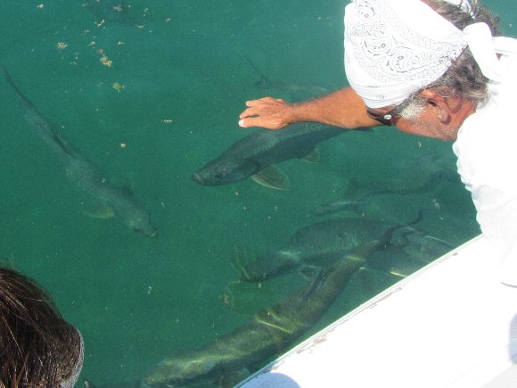 手を見せるだけで、集まってくる古代魚 ターポン |