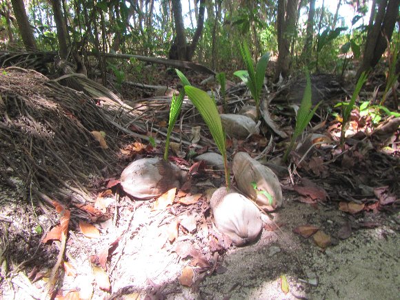 地に落ちた、椰子の実から目が出ている。