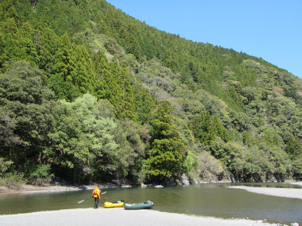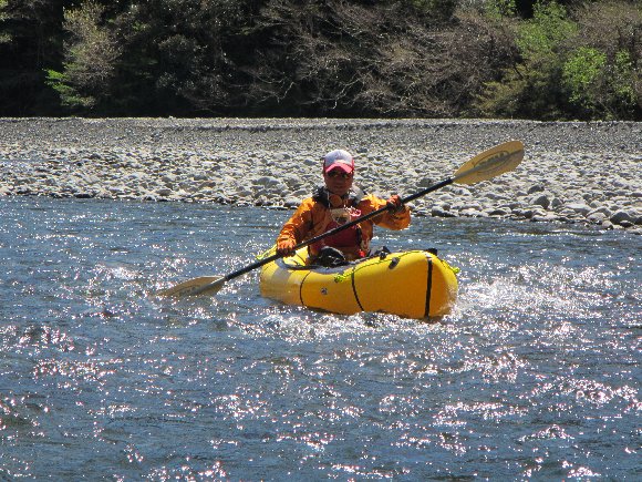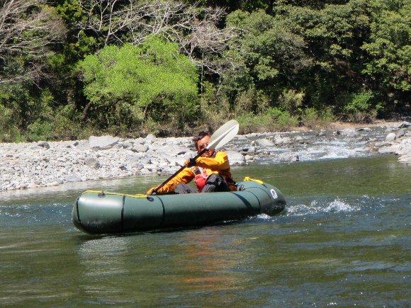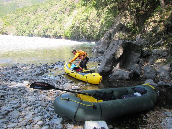 神社前河原の下流側で パックラフトを組み上げ スタート