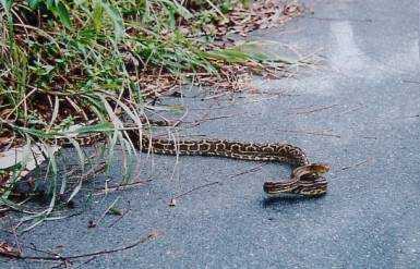 | 猛毒のハブ 島内に8万匹が生息 昼間は活動しないと言われているが、 金作原散策ツアーのガイドさんが、 以前ガイド中に撮った写真を、写真に撮りました ------------------------------------------------ ○ハブとマングース 奄美では、アマミノクロウサギなど固有種が生息しているが、 これは、ハブが大量に生息しているので、 人間が森に入らなかった為、動植物の住み分けがされていた事で 年に1匹しか子を産まない、アマミノクロウサギが 生存出来る環境が続いていたのである。 ハブ退治の為、マングースを野に放したが、 ハブを食べた、マングースは皆無である。 マングースにとっては、ハブなど食べる必要のない豊富な森で大繁殖し 固有種の アマミノクロウサギなどが、マングースの餌食になってしまった。 アマミノクロウサギは、山中深く入らないと、見ることが出来なくなった。 今、島では、あちこちにマングース捕獲の為のワナをしかけて、 マングースの捕獲作戦を実施中 林道や、畑などに、赤い布が下げてあるのは、ワナがある印である。 捕獲した、マングースの尻尾を、持って行くと報奨金がもらえる ハブは、島内に約8万匹が生息していると言われ 毎年 2万匹が捕獲されている 大きなハブは、業者が1万円くらいで、 ちいさいものは、役所で 5千円で引き取られるそうだ。 |