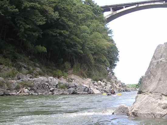 ![]() 鵞流峡 出口の橋が見える、 これから最後の瀬、カーブに入る |