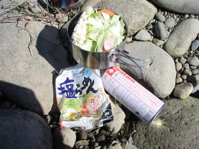 昼近くなったので、上陸し、昼休憩 いつもの塩煮込みラーメンを作る。