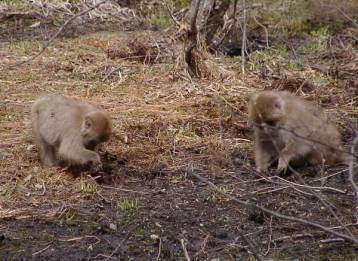| その近くの湿地で餌を食べる、猿の親子集団 |